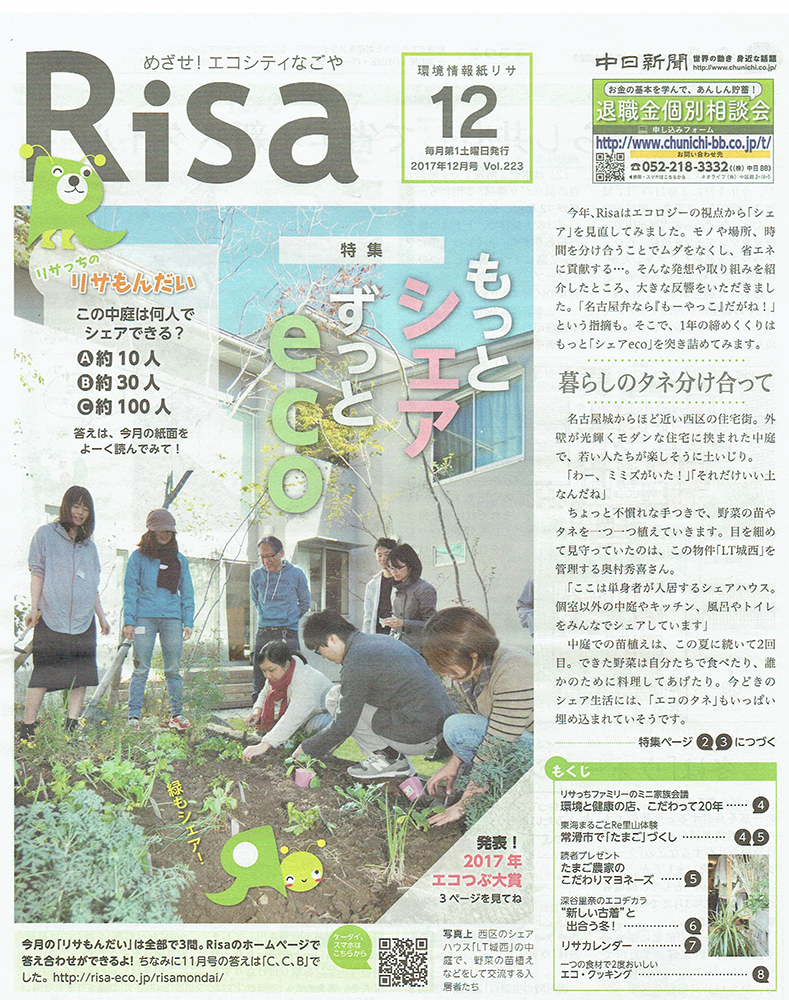 先日行った畑ワークショップの様子を、本日発行の『Risa』に掲載していただきました。『Risa』は 中日新聞の朝刊折込として、名古屋市全域に届けられています。名古屋市内の公立図書館全てにバックナンバーもストックされています。今回はエコという視点で、入居者の声と共にシェアハウスでの暮らしぶりを紹介しています。庭を利用した定期的なワークショップや、入居者自ら企画されるイベントなどに参加でき、ほどほどの距離感をたもちながらとても楽しそうに暮らしています。おかげさまで現在満室の状況。竣工直後に入居されていた方が近く退去されるとの話もありましたので、ご興味ある方はご検討されてみてはいかがでしょうか!