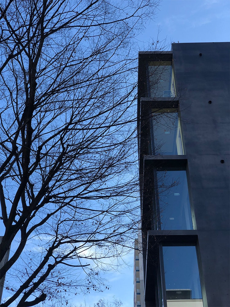 進行中のプロジェクト、新栄のオフィスビルの現場写真です。躯体工事も完了し、いよいよ足場解体となりました。コンクリート打放のテクスチャーを残しつつ濃灰色に着色した外壁と、冬の澄んだ青空のコントラストがとても綺麗です。