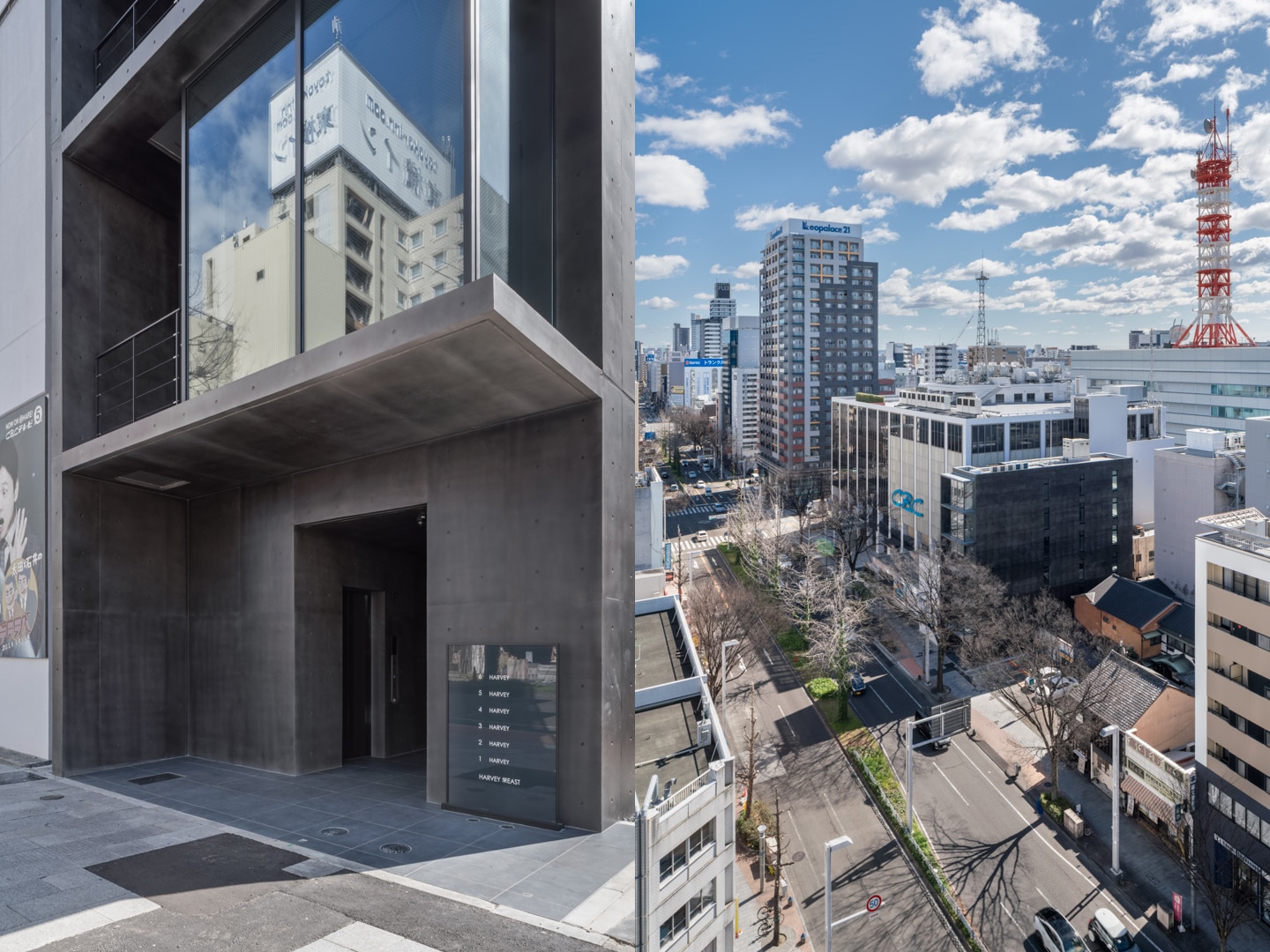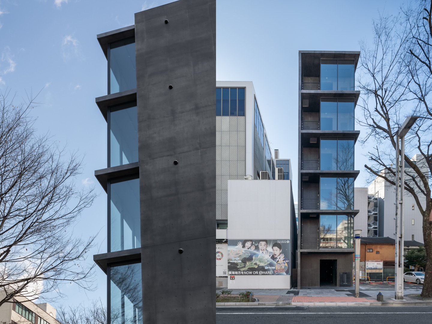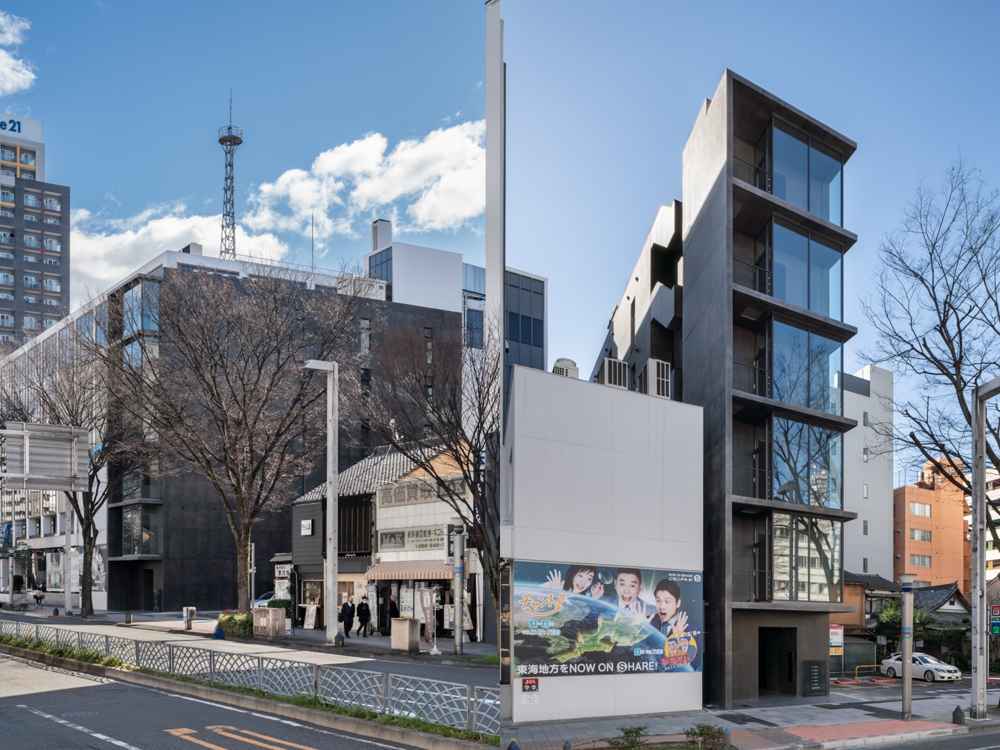 広小路通に面する敷地北側約6.5メートル間口に対し、1/3を避難上有効なバルコニー、残りを庇付きカーテンウォールで構成したファサードとし、内部から街路樹を立体的に楽しめる計画とした。さらにカーテンウォールは繁華街である栄地区方面へ回り込むように配置し、内部からの眺望の獲得と共に歩行者に対するテナントの視認性を高めるショーケースのような建築とした。夕景ではスポットライトにより照らされたショーケースが、街の賑わいに彩を加える。