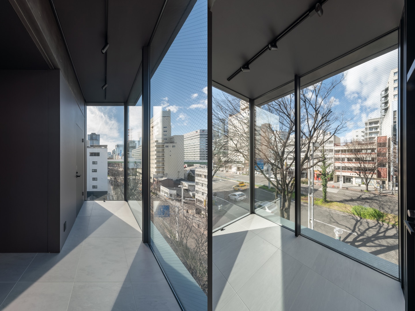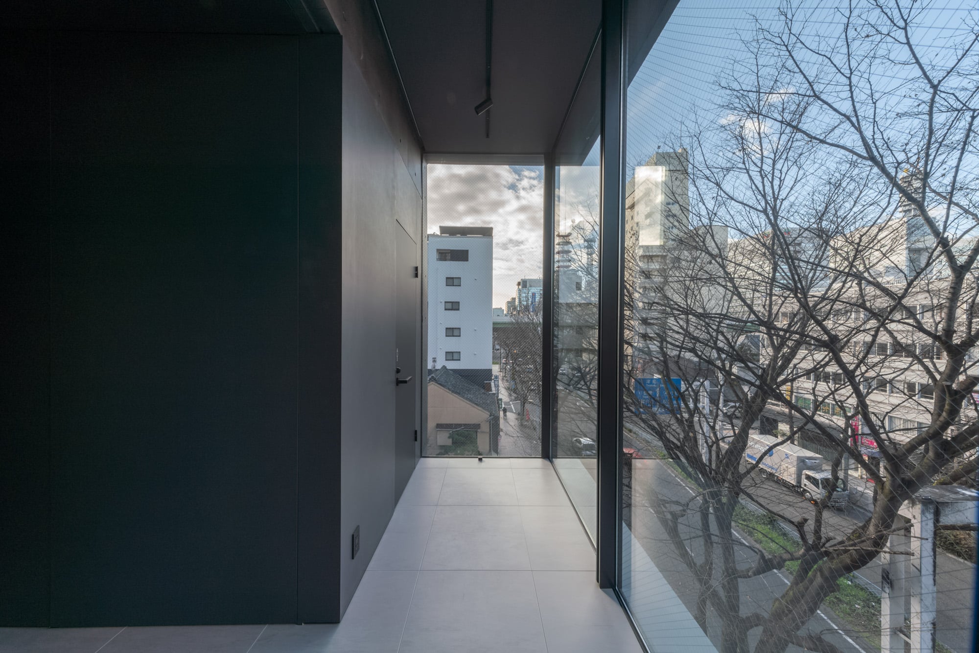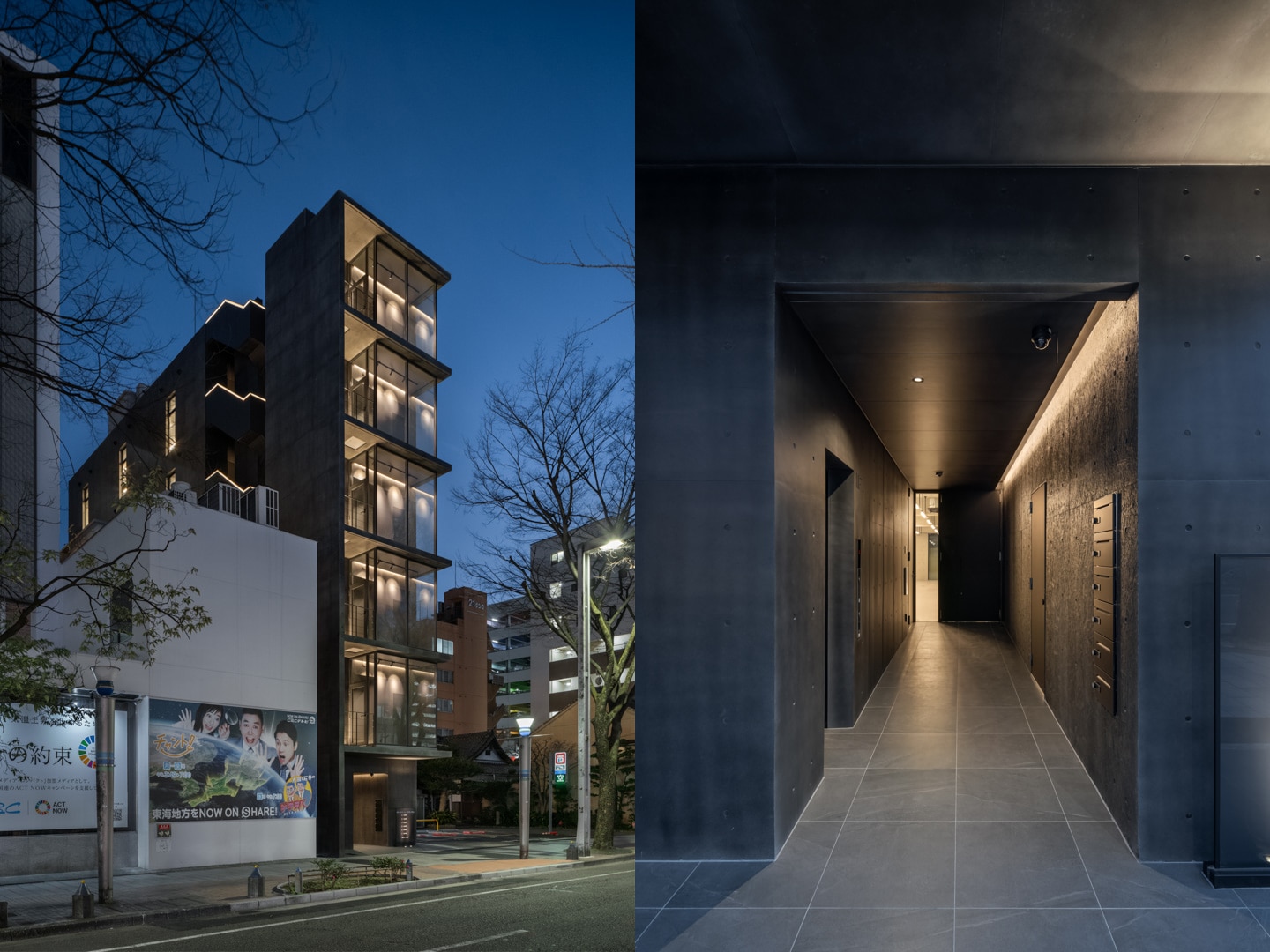 広小路通に面する敷地北側約6.5メートル間口に対し、1/3を避難上有効なバルコニー、残りを庇付きカーテンウォールで構成したファサードとし、内部から街路樹を立体的に楽しめる計画とした。さらにカーテンウォールは繁華街である栄地区方面へ回り込むように配置し、内部からの眺望の獲得と共に歩行者に対するテナントの視認性を高めるショーケースのような建築とした。夕景ではスポットライトにより照らされたショーケースが、街の賑わいに彩を加える。