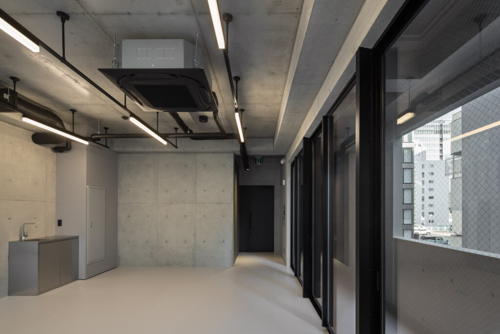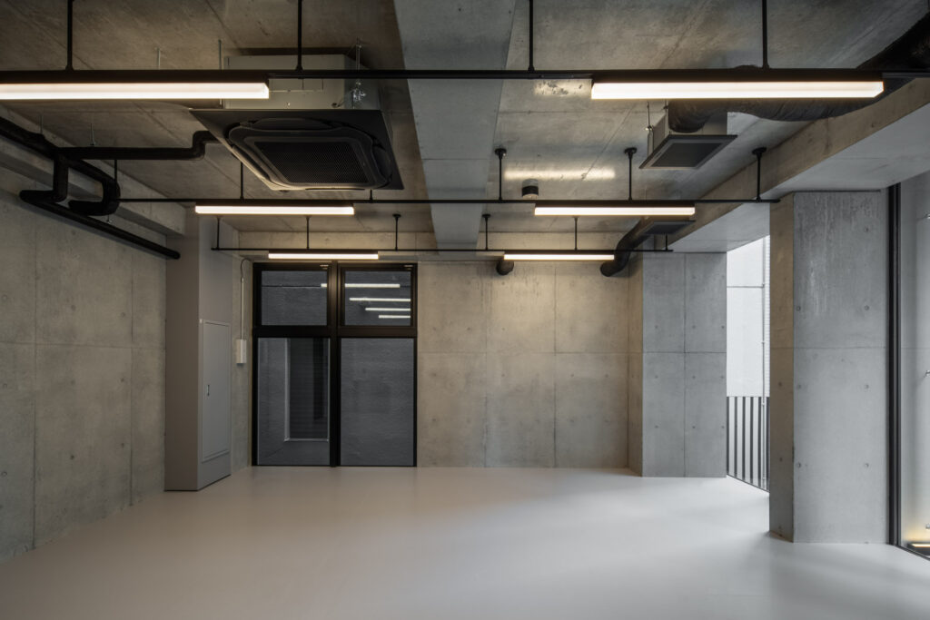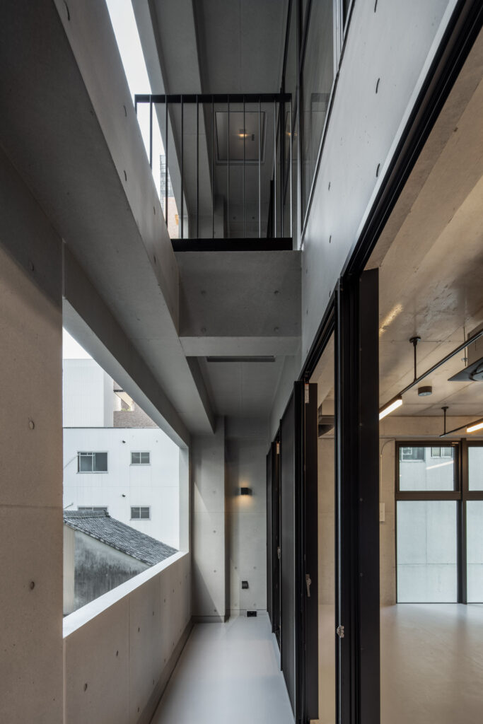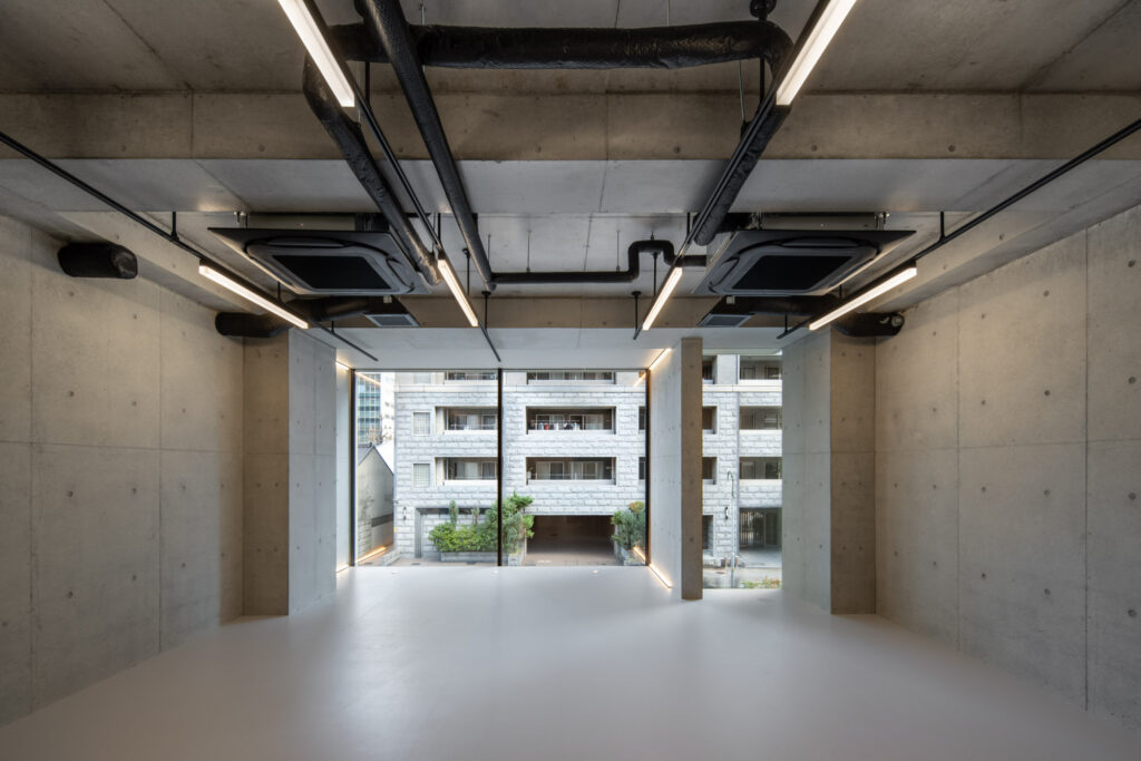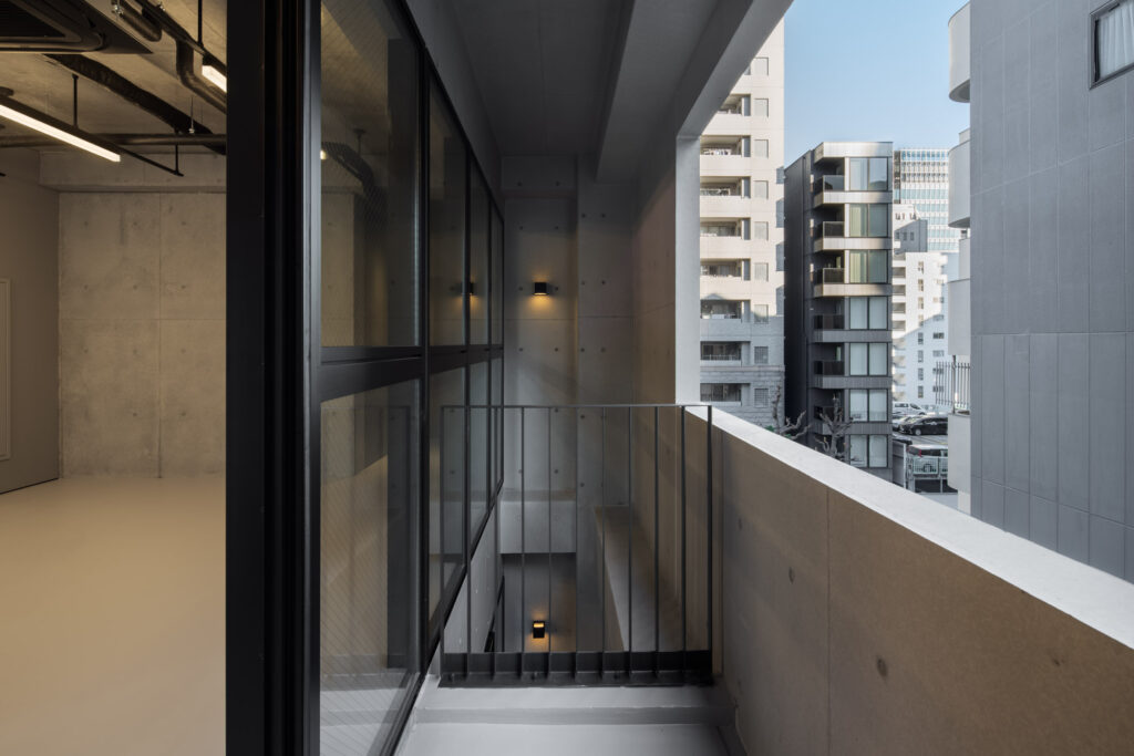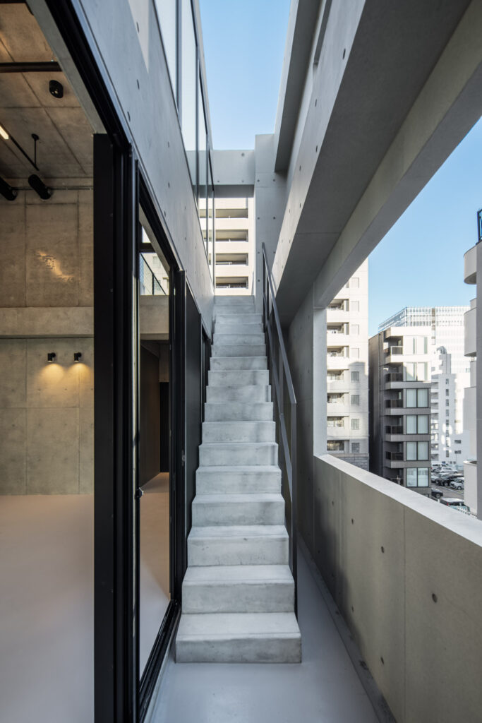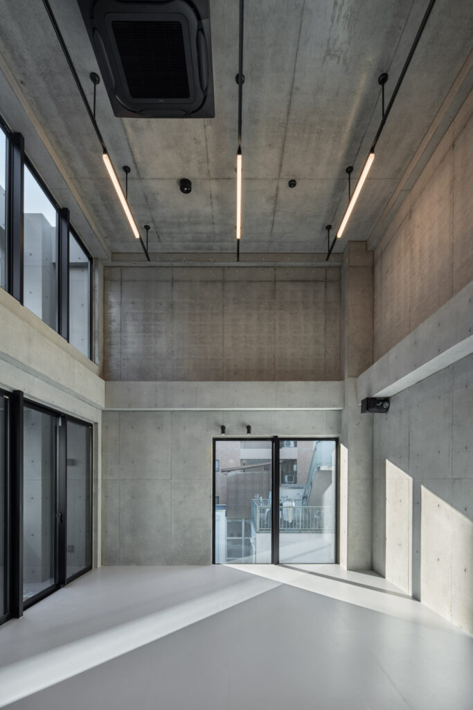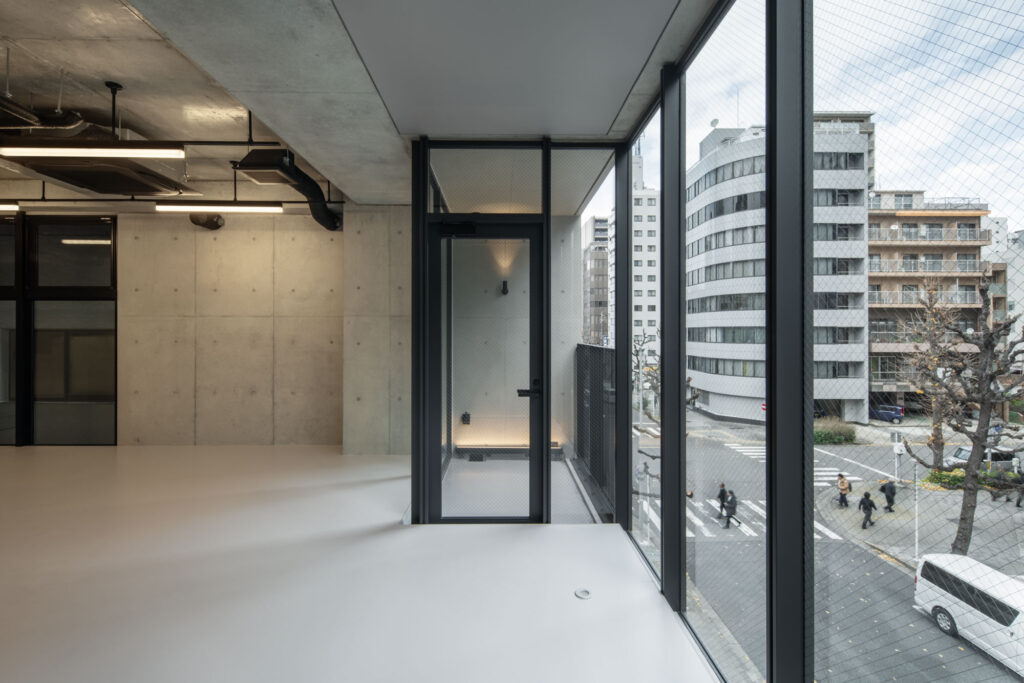 平面計画は、各階を道路側と敷地奥側の2テナントで構成している。将来的な用途の変化を見据えた柔軟な床を提供しつつ、敷地奥側のテナントには全階にわたって専用のテラスを附設した。特に、3階の奥側テラスは上部を2層分の吹き抜けとして4階テラスと立体的に繋げ、高密度な都市の深部に光と風を呼び込む装置とした。また、最上階となる5階奥側のテナントは、天井高5.4mのダイナミックな気積を確保。上部に配した高窓からは空を切り取るように光を取り込み、周辺のビル群に囲まれながらも、都市の喧騒から切り離された開放的な内部空間を実現している。