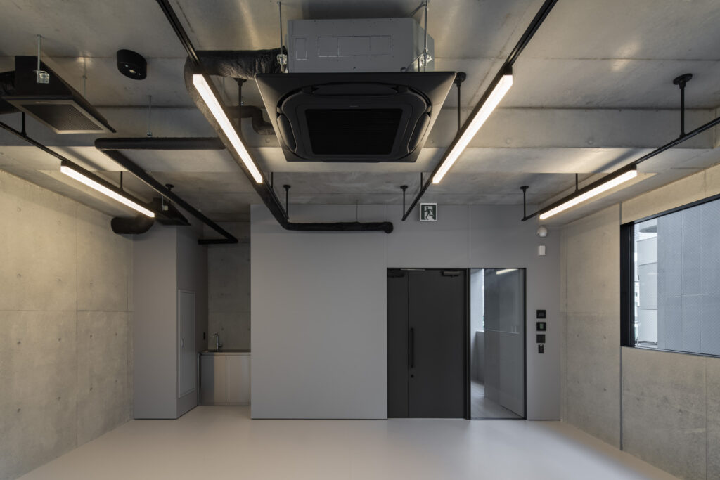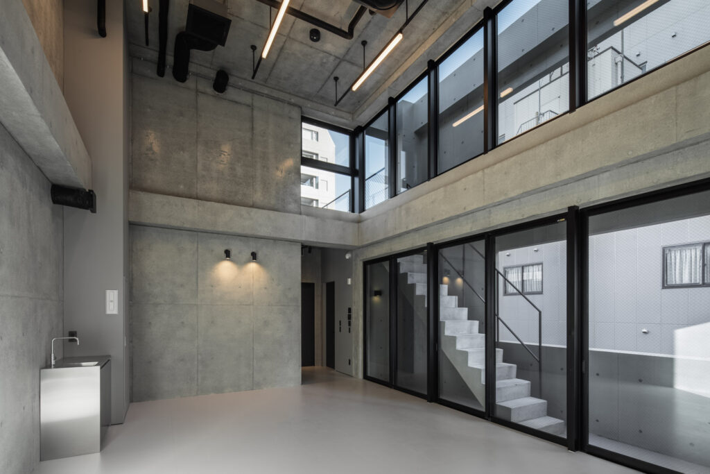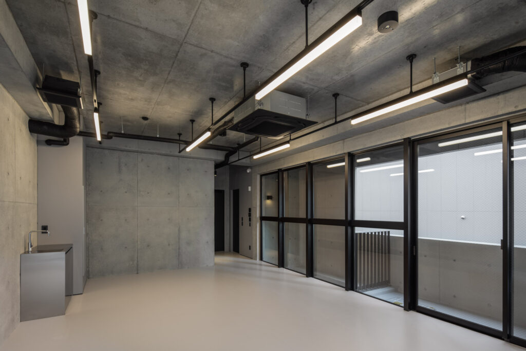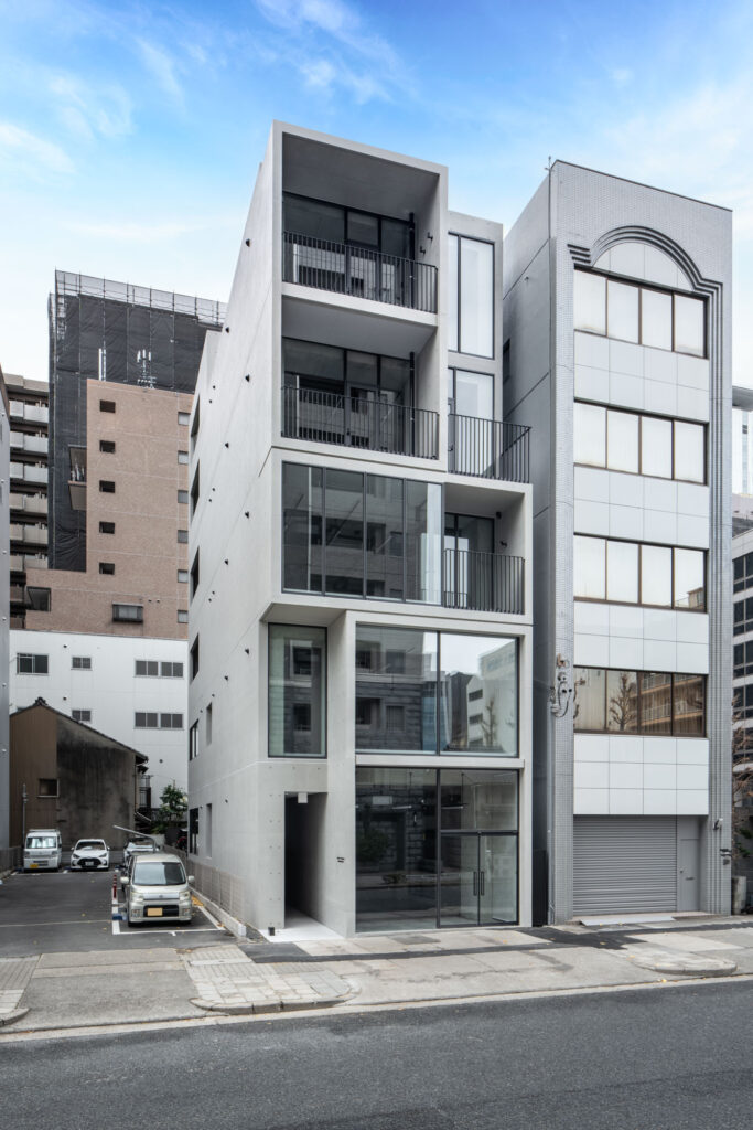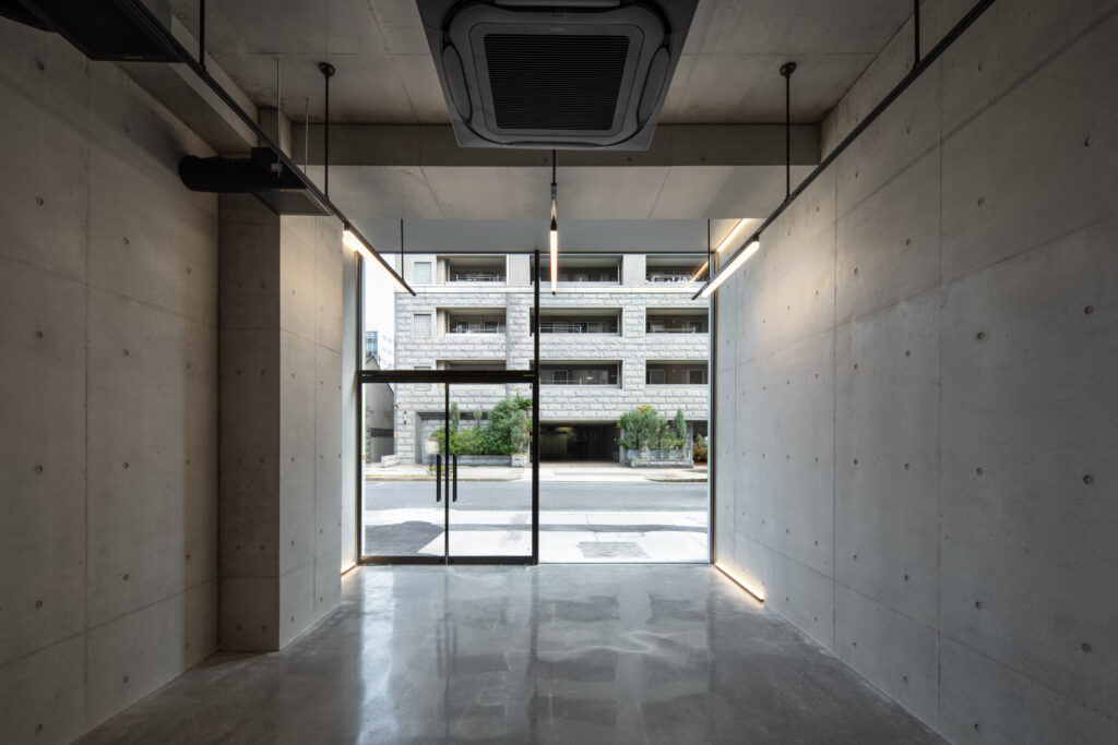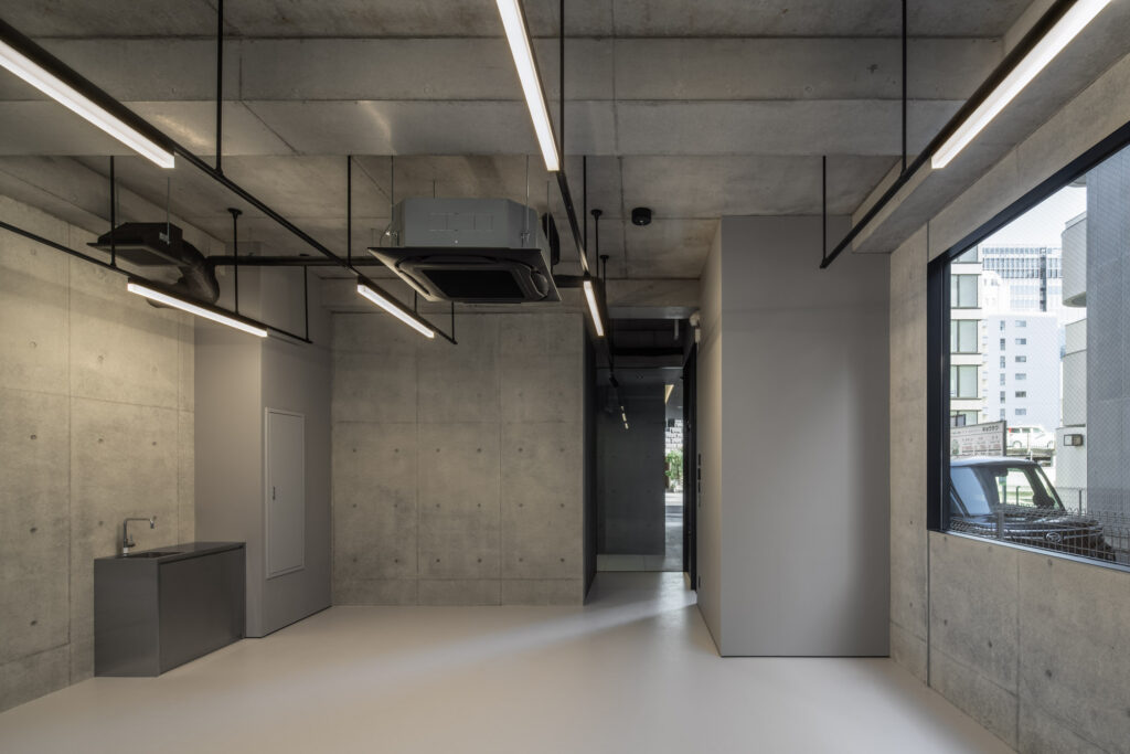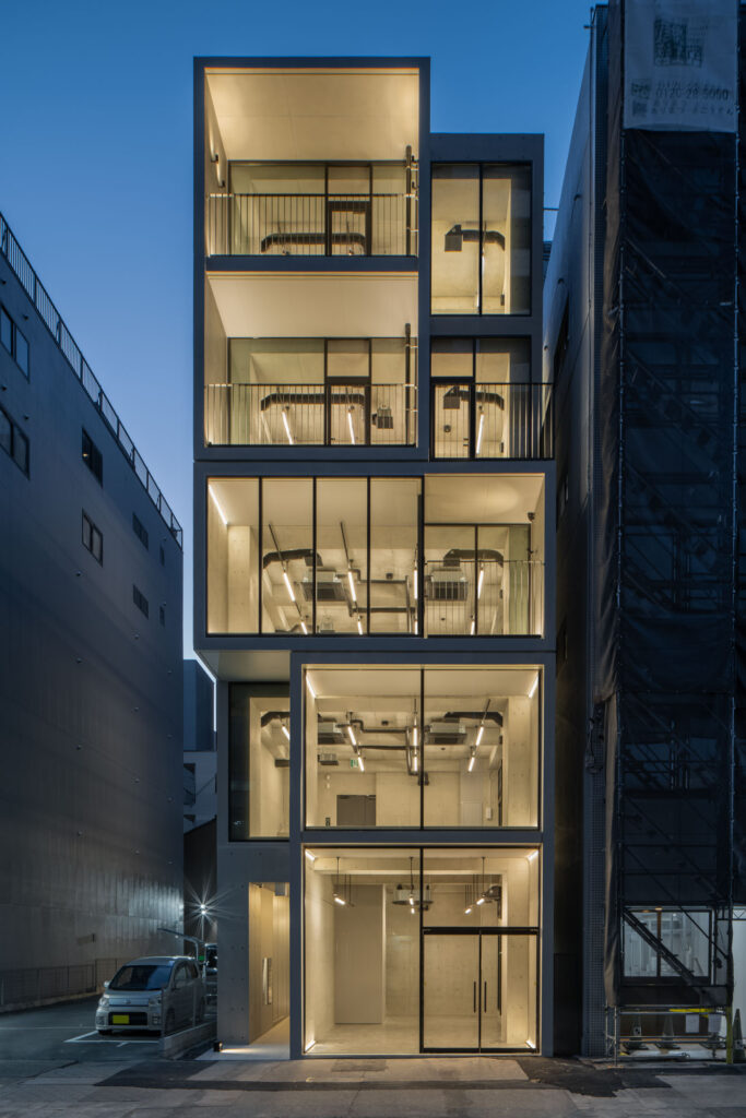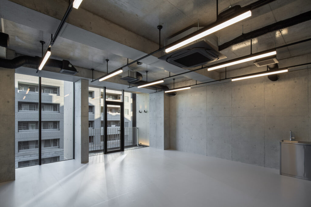平面計画は、各階を道路側と敷地奥側の2テナントで構成している。将来的な用途の変化を見据えた柔軟な床を提供しつつ、敷地奥側のテナントには全階にわたって専用のテラスを附設した。特に、3階の奥側テラスは上部を2層分の吹き抜けとして4階テラスと立体的に繋げ、高密度な都市の深部に光と風を呼び込む装置とした。また、最上階となる5階奥側のテナントは、天井高5.4mのダイナミックな気積を確保。上部に配した高窓からは空を切り取るように光を取り込み、周辺のビル群に囲まれながらも、都市の喧騒から切り離された開放的な内部空間を実現している。