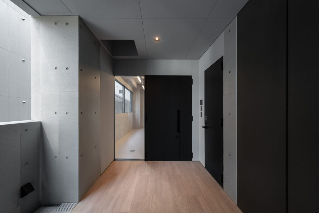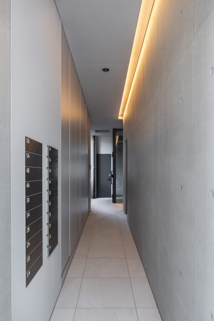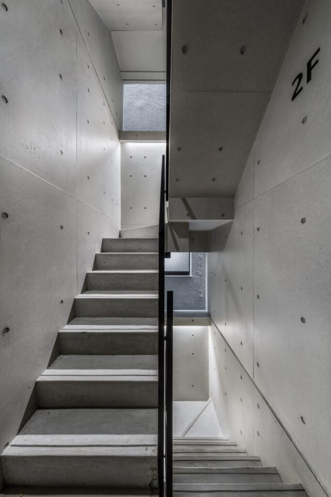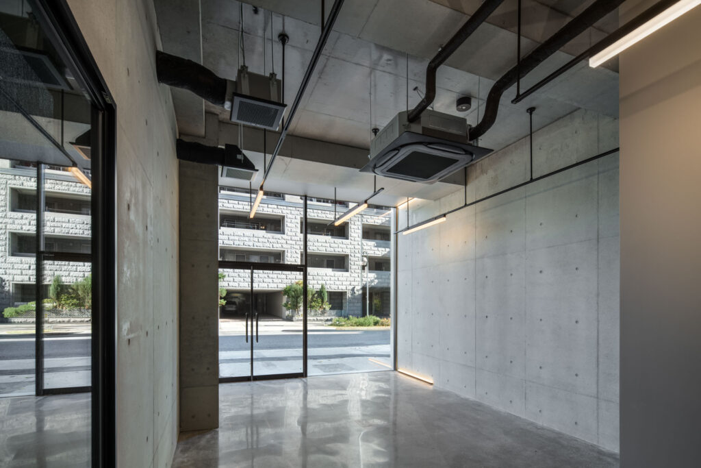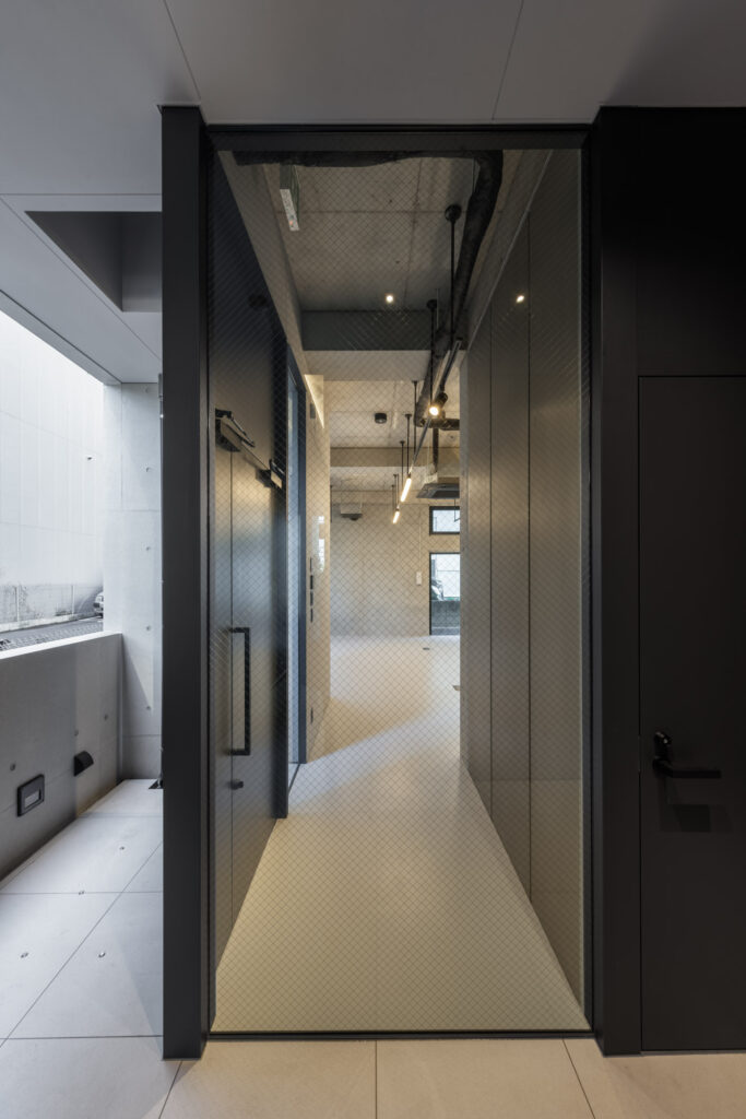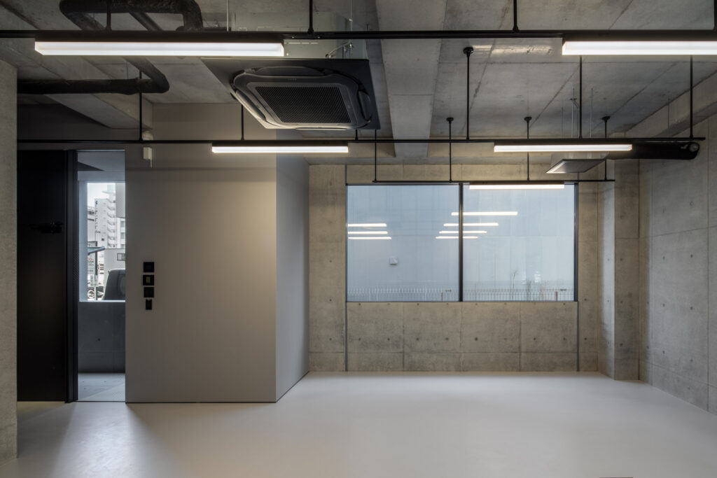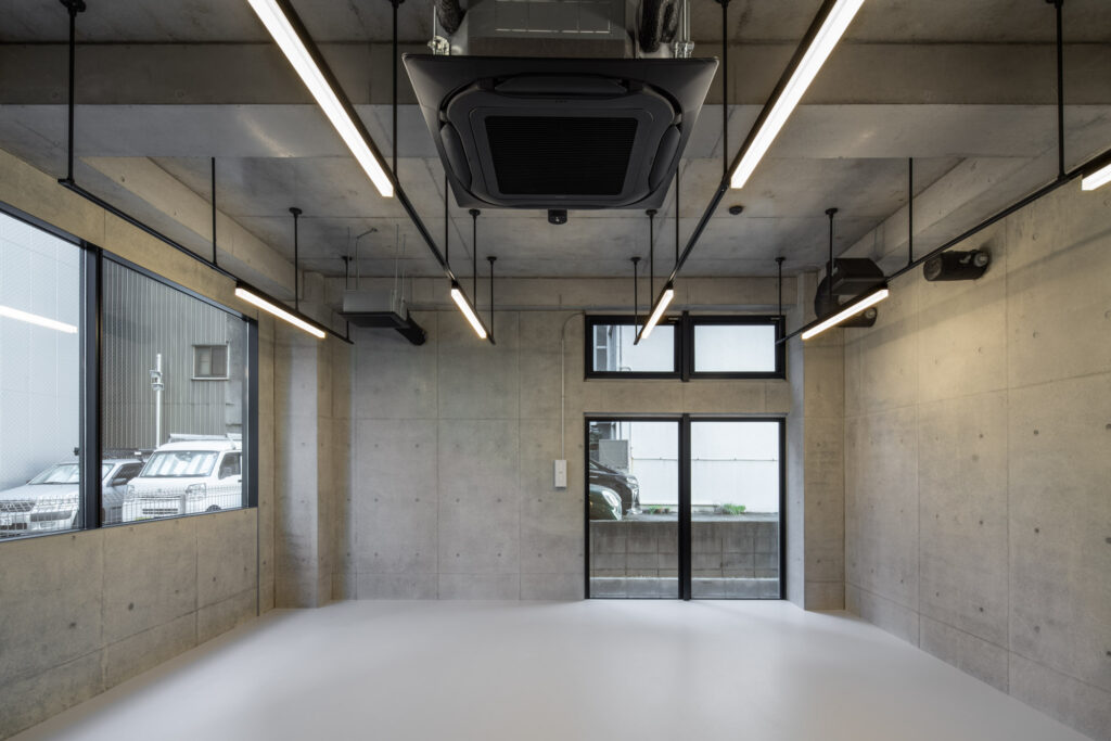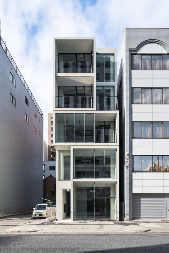 平面計画は、各階を道路側と敷地奥側の2テナントで構成している。将来的な用途の変化を見据えた柔軟な床を提供しつつ、敷地奥側のテナントには全階にわたって専用のテラスを附設した。特に、3階の奥側テラスは上部を2層分の吹き抜けとして4階テラスと立体的に繋げ、高密度な都市の深部に光と風を呼び込む装置とした。また、最上階となる5階奥側のテナントは、天井高5.4mのダイナミックな気積を確保。上部に配した高窓からは空を切り取るように光を取り込み、周辺のビル群に囲まれながらも、都市の喧騒から切り離された開放的な内部空間を実現している。