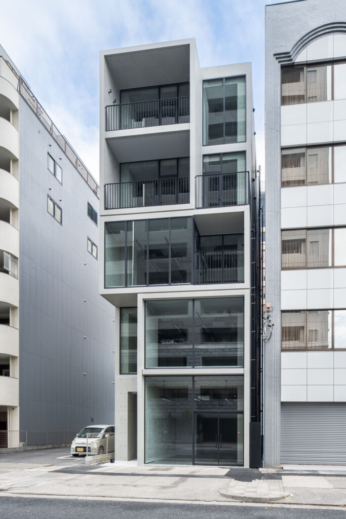 本計画では、画一的なボリュームとしてのビルディングタイプを避け、各フロアを独立した「箱」として垂直に積み上げる構成を採用した。あたかも積み木を重ねたかのような分節的なファサードは、周囲の巨大な建築群と小規模な建築の間に、新たな中間的スケールを挿入する試みである。この積み木の「ズレ」を活かし、道路側では都市の隙間に呼応する外部空間を配置した。