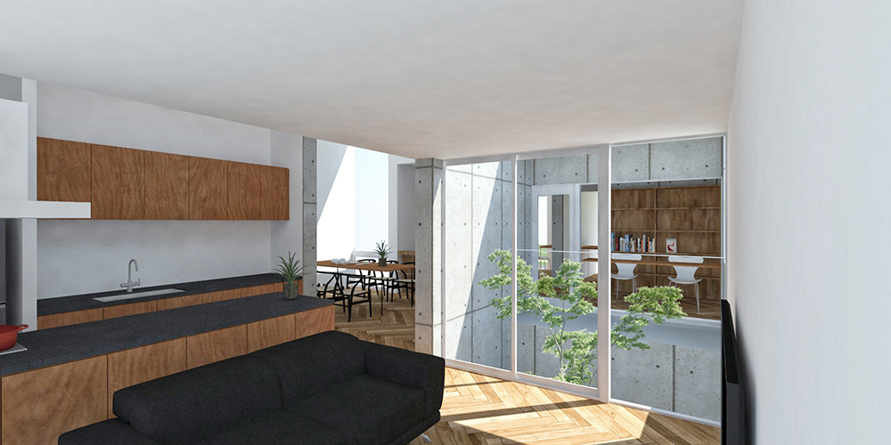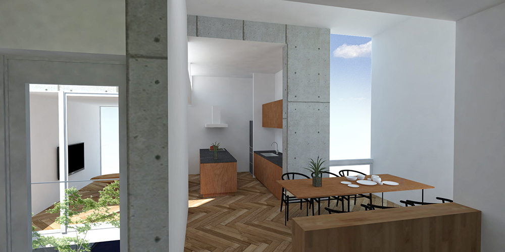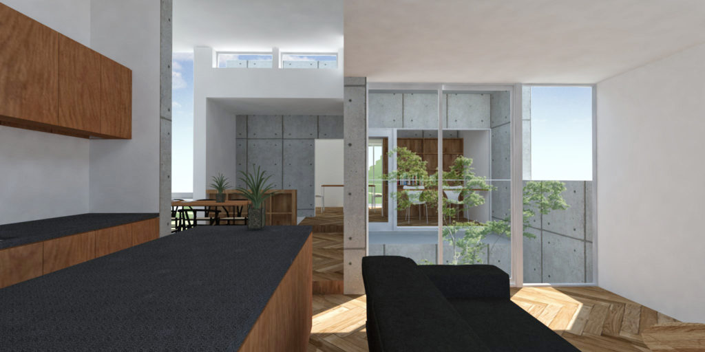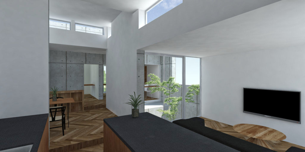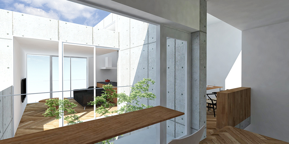 敷地内高低差が5mを超える、丘陵地に建つ戸建住宅の提案。北斜面の敷地に、道路からのアプローチと建物高さ制限を考慮した建築ボリュームを検討すると、1階の南側居室はほぼ地中に計画することとなる。また、南隣地との距離が近いため、2階レベルでも南側からの光は厳しい。そこで南側1階には、ビルトインガレージと水廻りを計画し、それぞれに挟まれた中央へ土留めを兼ねた外部吹抜けを設け、ライトウェル(光井戸)となる庭を配置した。2階ではリビング、ダイニング、キッチン、ライブラリーがライトウェルを囲み、明るい内部環境を実現する。また、北側と南側の建物高さに高低差を設け、ハイサイドライトを設置し、光の入りにくい北側の居室にも光と風を獲得する。 ライトウェルに囲まれた高さの異なる建築ボリュームにより、厳しい条件である敷地の高低差を克服し、近接する隣家とのプライバシーを確保した、家族のつながり、光と風を感じる生活を設計した。